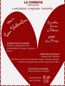 ❤️ SAN VALENTÍN EN LA CORBATA ❤️ Este 14 de febrero, celebra el amor con un menú especial para compartir en La Corbata Restaurantes. Menú San Valentín • Fondue de camembert frito con mermelada de tomate, totopos y tostas • Burger San Valentín con pan rojo, carne de vacuno, rúcula, tomates cherry caramelizados, pesto y